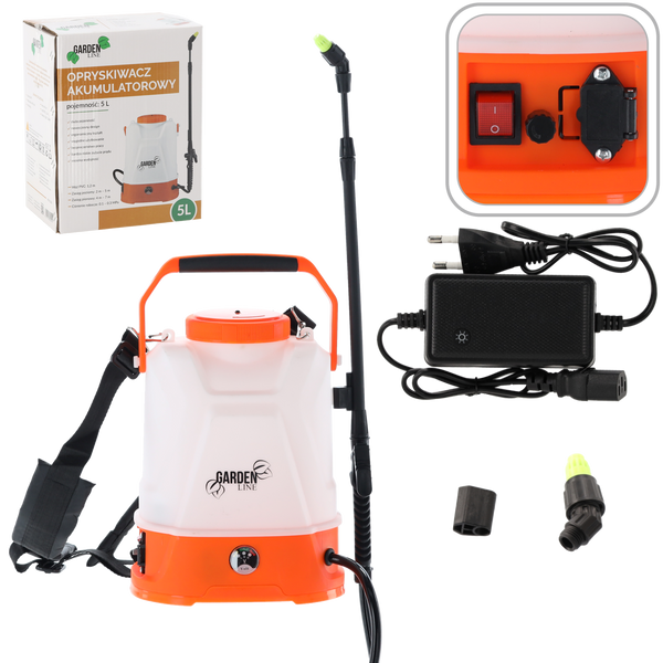 Opryskiwacz akumulatorowy to przenośne, elastyczne i wysoce skuteczne narzędzie o pojemności 5 L. Może być stosowany do ochrony roślin przed chorobami oraz szkodnikami w ogrodach, parkach, plantacjach, polach uprawnych itd.