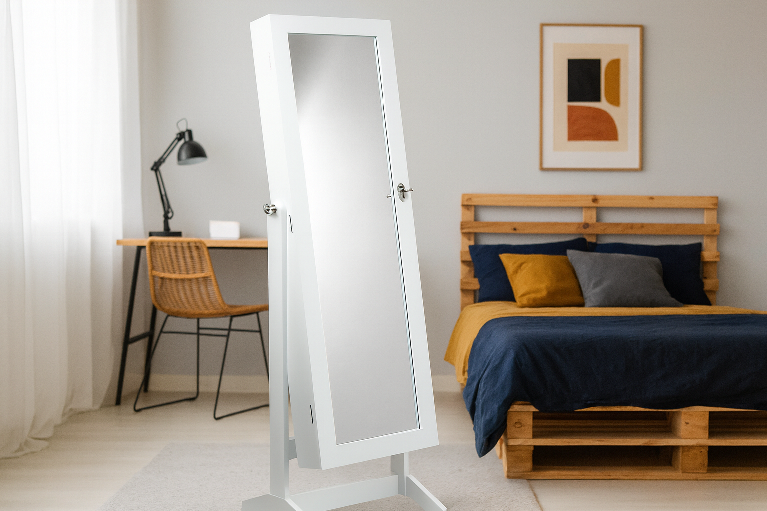 Tato skříňka je kombinací funkčnosti a stylu. Zajišťuje pohodlí každodenního používání, usnadňuje organizaci šperků a doplňků, a díky velkému zrcadlu se stává praktickým prvkem každé ložnice. Její elegantní vzhled jí umožňuje dokonale se hodit jak do moderních, tak do klasických interiérů. To je ideální volba jak pro sebe, tak jako dárek pro blízkou osobu. ❤