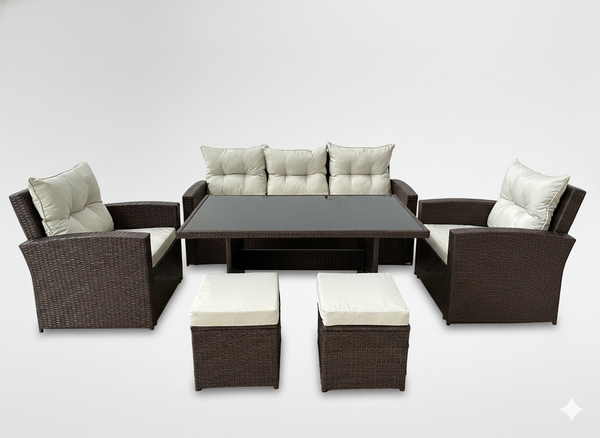 DUŻY ZESTAW MEBLI OGRODOWYCH (SOFA, 2 FOTELE, 2 PUFY, STOLIK) - BRĄZOWY, PODUSZKI - BEŻOWY