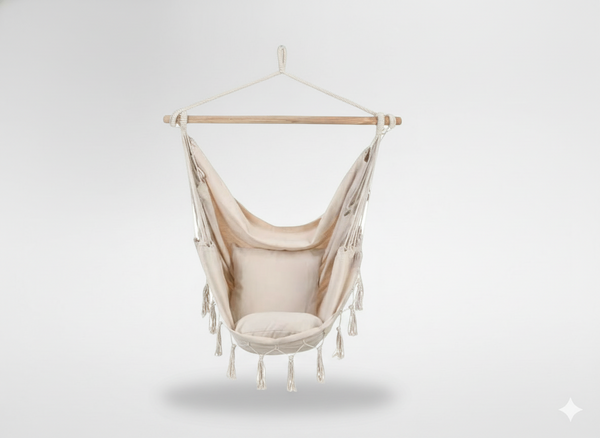 Przenieś się do świata relaksu z brazylijskim krzesłem wiszącym w stylu BOHO. Naturalny beż, miękka tkanina i delikatny design tworzą atmosferę spokoju i przytulności – idealną na leniwe popołudnia.