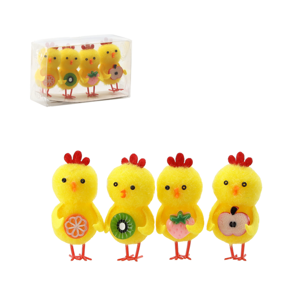 KPL. 4 VELIKONOČNÍCH OZDOB - KUŘÁTKA S OVOCEM 12 x 6 x 3,5 CM MIX OBRÁZKŮ *9311