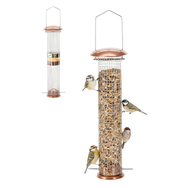 Velké krmítko ve tvaru trubky na semena, vyrobené z kovu a kovového drátu v efektní barvě mosazi. Vybavené pohodlným prvkem pro zavěšení, ideální pro přikrmování ptáků na zahradě nebo balkóně.