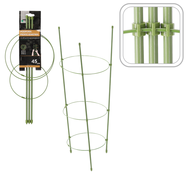 Podpora kruhová se sloupky je skvělá volba pro rostliny v květináčích a na záhony. Díky solidnímu provedení z kovu a pokrytí plastem je velmi odolná proti poškození a nepříznivým povětrnostním podmínkám, a díky zelené barvě je téměř neviditelná na pozadí rostliny. Užívá se například při pěstování: borůvek amerických, hortenzie. Zabraňuje "polehnutí" rostliny a umožňuje její harmonický růst. Podpora kruhová může být zajímavou alternativou k různým jednotlivým tyčkám. Zelená barva produktu se dokonale doplňuje s rostlinami, také jako dekorace zahrad. Podporu je třeba umístit do země vedle rostliny a přivázat k ní stonku, tím zajistíme dokonalou stabilizaci a ochranu před zlomením i za větrného počasí.