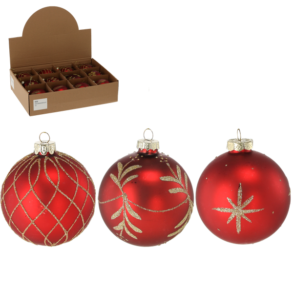 SKLENĚNÁ OZDOBY - MATNÁ ČERVENÁ 8 CM MIX VZORŮ disp=12ks *4815