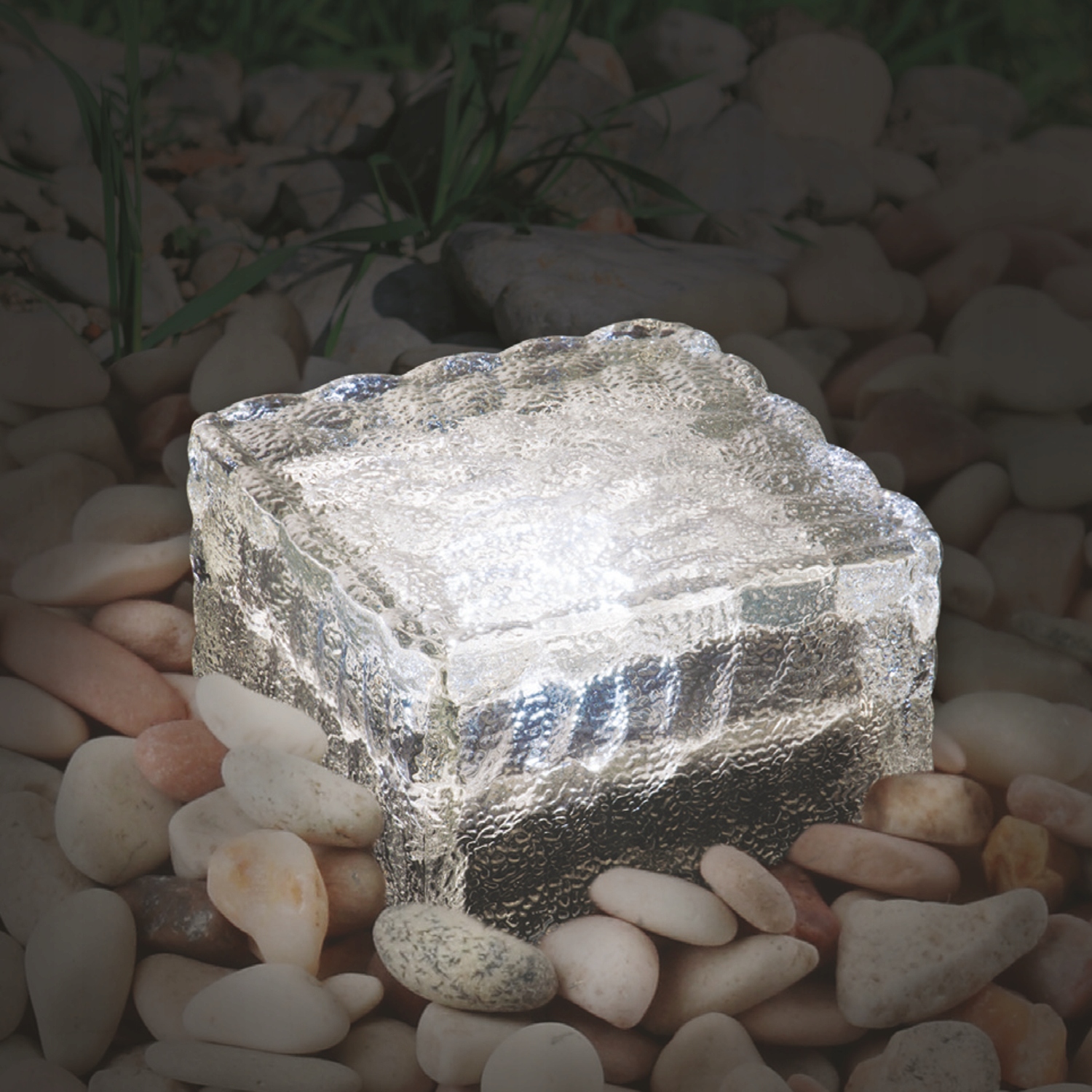 Skleněná kostka imituje kámen, přidávající eleganci každé zahradě.