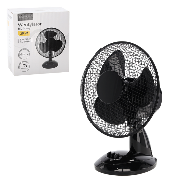Stolní ventilátor ideální k použití v kanceláři, na stole nebo v menších místnostech, zajišťující komfort používání díky funkci regulace rychlosti a úhlu sklonu.