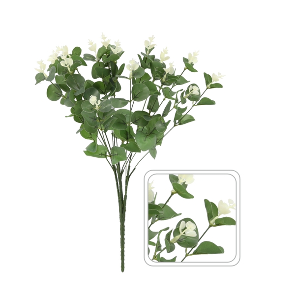 UMĚLÁ VĚTEV - EUKALYPTUS S BÍLÝMI KVĚTY 46 CM balení=150ks *3987