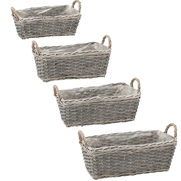 Elegancka, wiklinowa osłonka w kształcie prostokątnego koszyczka z uszkami. Wyposażona w folię wewnętrzną, która zapobiega wyciekaniu ziemi i wody. Idealna do sadzenia roślin, nadając naturalny akcent każdemu wnętrzu lub ogrodowi.