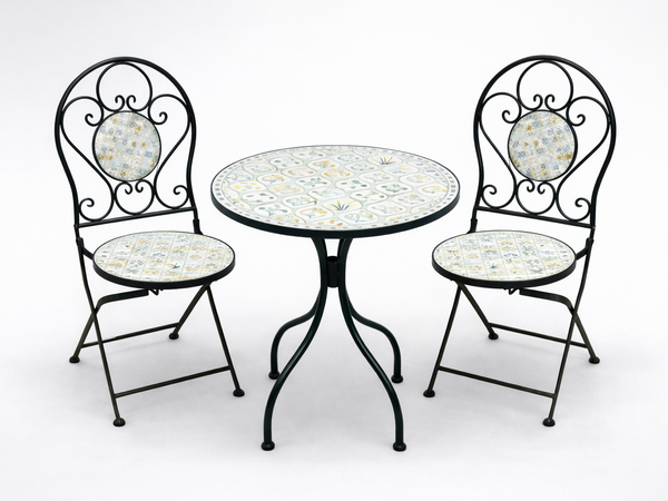 - Elegancki zestaw mebli ogrodowych metalowych z dekoracyjną mozaiką LOULOUDIA. Stół i dwa składane krzesła idealne na balkon, taras i do ogrodu. Trwała konstrukcja, stylowy design i komfort użytkowania na co dzień.