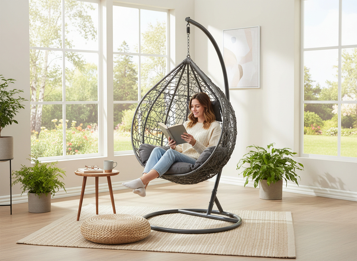 Potrzebujesz chwili relaksu z książką, kawą lub w błogiej ciszy? Fotel wiszący w odcieniach ciemnej szarości to idealne rozwiązanie dla Twojej strefy wypoczynku.