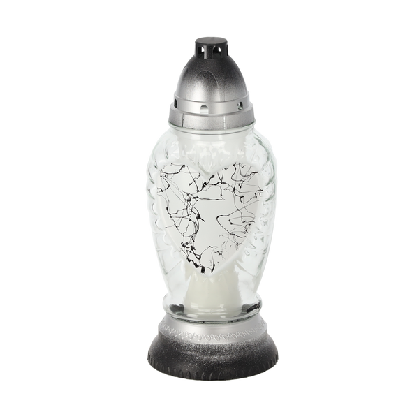 The candle is 29 cm tall, model Z385, in a white-silver color with a heart motif. It provides a flame for up to 40 hours, combining aesthetics with functionality. Ideal for decorating graves.