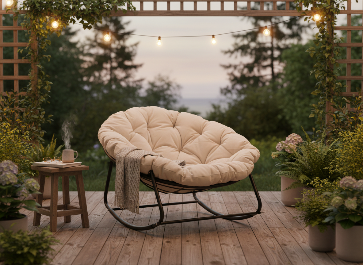 Oto fotel bujany, który stanie się Twoim nowym ulubionym miejscem relaksu! Połączenie miękkiej, jasnobeżowej poduszki z elegancką szarą ramą to nie tylko wygoda, ale i styl, który doskonale odnajdzie się w każdej aranżacji – od ogrodu, przez taras, aż po wnętrze domu. 🌿🏡