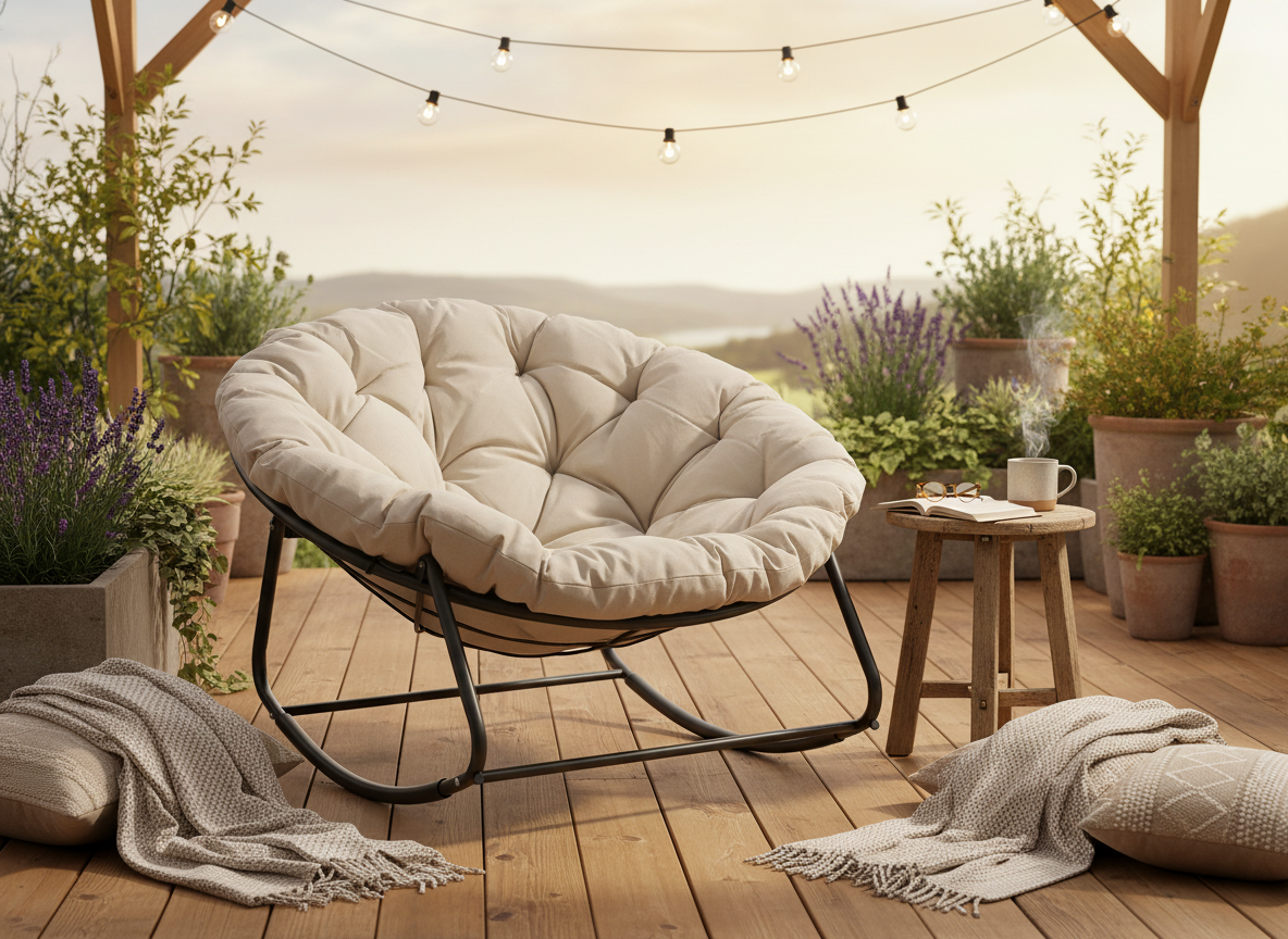 Ten fotel to kwintesencja relaksu i stylu. Dzięki funkcji bujania odprężysz się jak nigdy dotąd, a jego design wkomponuje się idealnie w każdą przestrzeń. Mocna konstrukcja i odporna tkanina gwarantują trwałość na lata – to doskonała inwestycja w Twój komfort! 🎁🌞