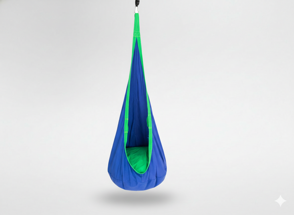 Zanurz się w świat relaksu i zabawy! Niebieski kokon wiszący to idealna kryjówka dla dzieci, w której mogą odpocząć, poczytać książkę albo pobujać się z ulubioną maskotką.