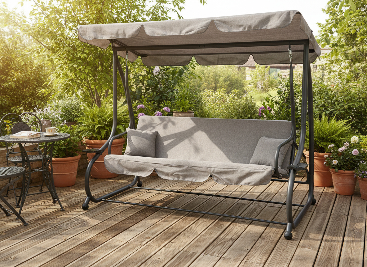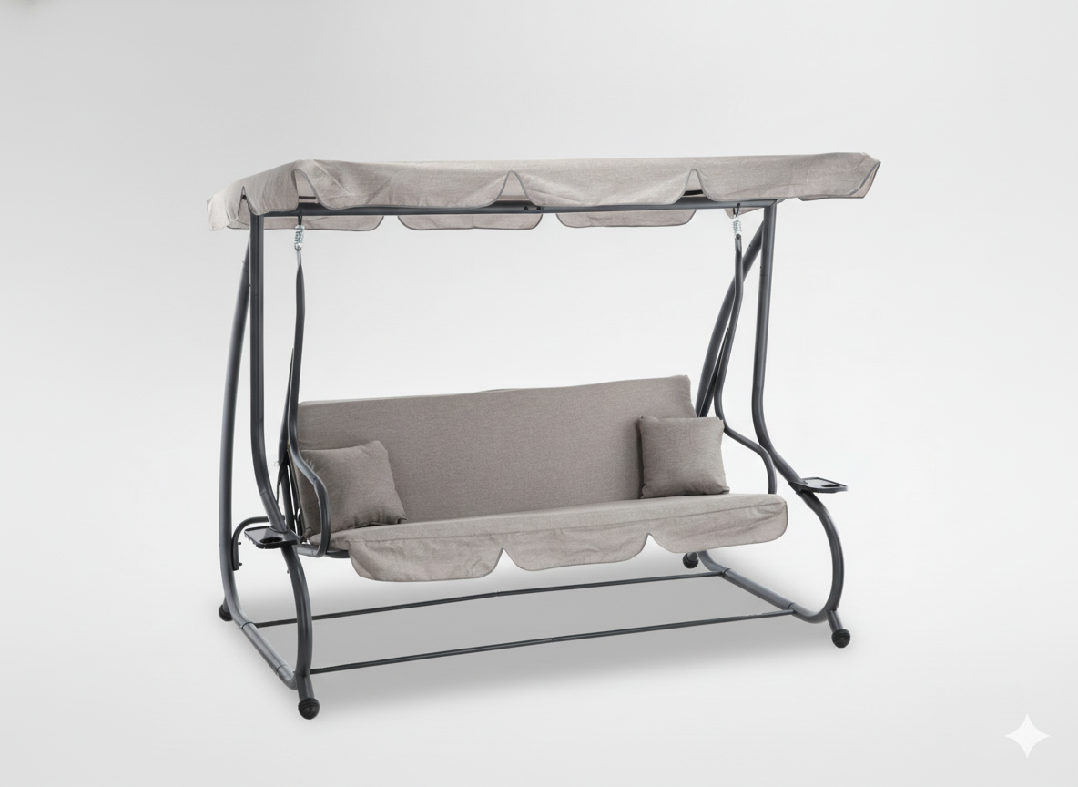 Marzysz o spokojnym relaksie na świeżym powietrzu? Ta stylowa huśtawka ogrodowa w kolorze szarego melanżu zamieni Twój ogród w prywatną strefę wypoczynku! 😌