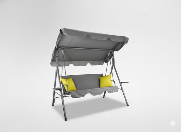 HUŚTAWKA OGRODOWA A-TYPE – SZARA Z LIMONKOWYMI PODUSZKAMI 🍋