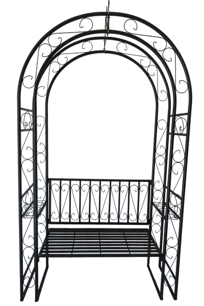 Zachwyca metalową konstrukcją z ozdobnymi ornamentami, zapewnia wygodę dzięki zintegrowanej ławce i doskonale sprawdza się jako podpora dla roślin pnących 🌿