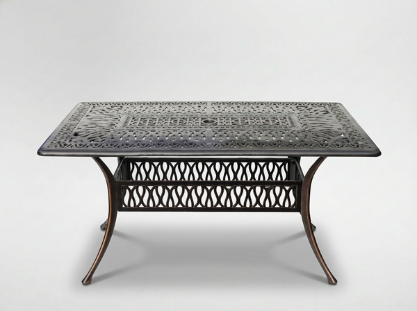 - Elegancki stół ogrodowy HASTINGS z aluminium w antycznym brązie. Wymiary 150x90x73 cm, malowany proszkowo, odporny na warunki atmosferyczne. Idealny do ogrodu, na taras i do przestrzeni komercyjnych.