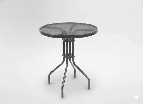 - Okrągły stolik ogrodowy z metalowym stelażem i szklanym blatem 60 cm. Odporny na warunki atmosferyczne, stabilny i łatwy w czyszczeniu. Idealny do ogrodu, na taras lub balkon. Możliwość stworzenia zestawu z krzesłami.