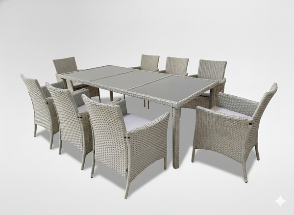 - Elegancki zestaw mebli ogrodowych z technorattanu w kolorze szarym. Duży stół z hartowanym szkłem oraz 8 wygodnych krzeseł z poduszkami. Trwała stalowa konstrukcja, odporność na warunki atmosferyczne i nowoczesny design.