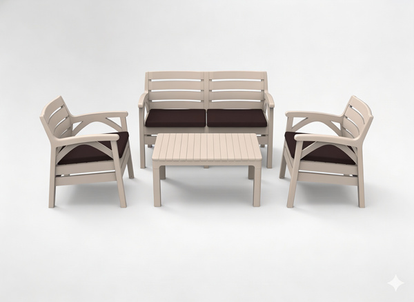 - Elegancki zestaw mebli ogrodowych Santana w kolorze cappuccino z brązowymi poduszkami. W komplecie 2 fotele, ławka dwuosobowa i praktyczny stół. Idealny do ogrodu, na taras lub balkon. Komfort, styl i funkcjonalność w jednej aranżacji.