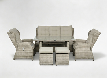 ZESTAW MEBLI RATTANOWYCH ( SOFA NAROŻNA + 2 PUFY + STOLIK Z REGULOWANĄ WYS. ) SZARY + SZARE PODUSZKI