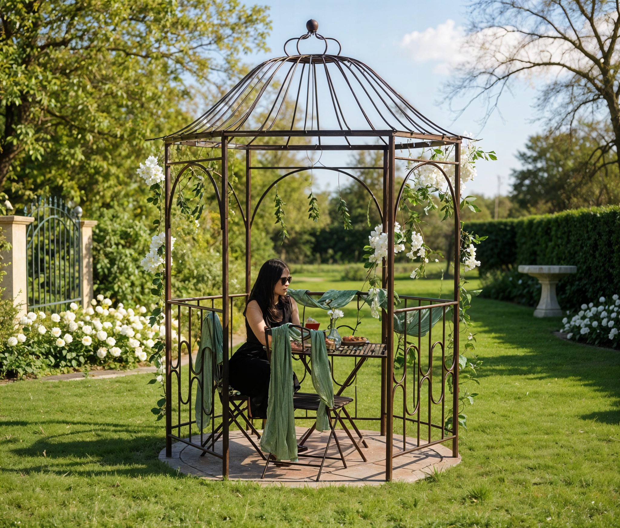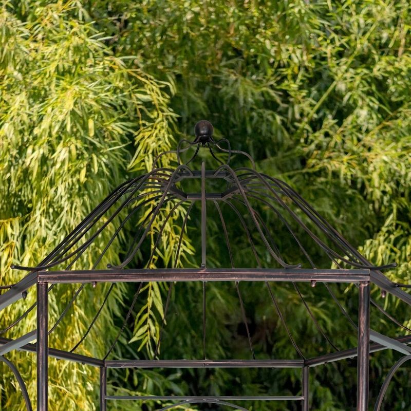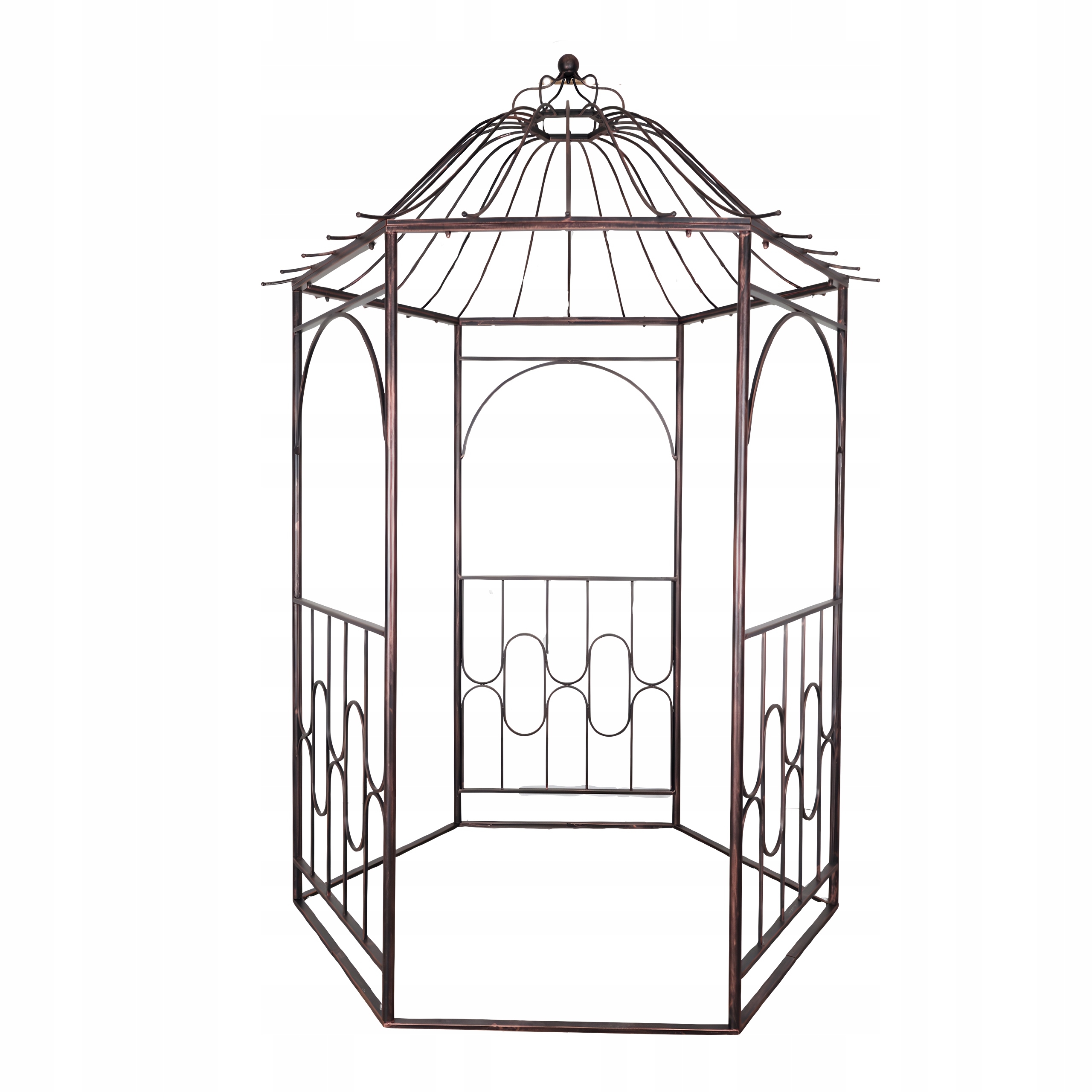 Altana ogrodowa wykonana z metalu w kolorze antycznego brązu to doskonały wybór dla miłośników klasycznego, romantycznego stylu. Wysokie sklepienie oraz ozdobne łuki i przęsła nadają jej lekkości i elegancji.