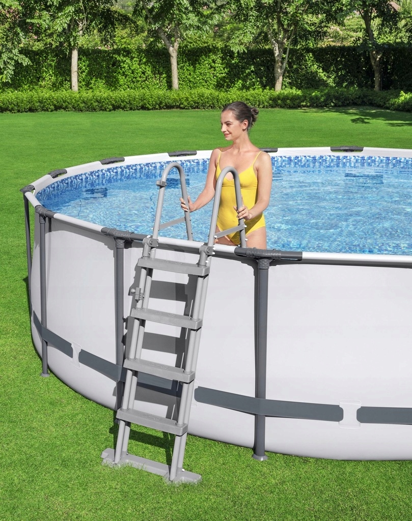 - Osadzona na metalowym stelażu drabinka ułatwi wchodzenie i wychodzenie z basenu.