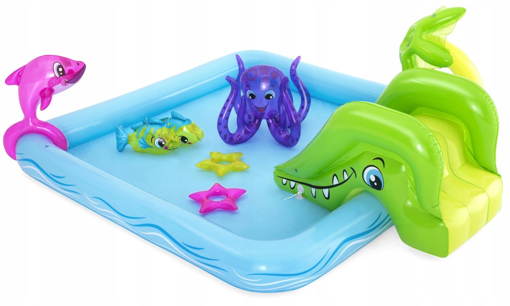 Baw się wraz ze zwierzętami morskimi w wodnym placu zabaw Bestway® Fantastic Aquarium! Dzieci będą się świetnie bawić z delfinem, błazenkiem i ośmiornicą.Dodatkowo mogą rzucać pierścienie dołączone w zestawie na macki! Podłącz wąż ogrodowy, a palma będzie tryskać wodą, 💦 zapewniając dzieciom dodatkową rozrywkę i ochłodę podczas zabawy na słońcu. Dzięki odpinanej zjeżdżalni, dzieci mogą zjeżdżać do basenu. W wodnym placu zabaw znajduje się również łatwy w użyciu zawór spustowy służący do wypuszczania wody z basenu, dzięki czemu można łatwo wyczyścić i przechowywać basen po zakończeniu zabawy.Aby cieszyć się latem pełnym zabawy, Ty i Twoje dzieci potrzebujecie wodnego placu zabaw Bestway Fantastic Aquarium!