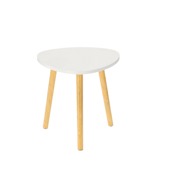 - Nowoczesny zestaw dwóch stolików kawowych o nieregularnym kształcie trójkąta z zaokrąglonymi rogami. Białe blaty z MDF i drewniane nogi w naturalnym kolorze tworzą eleganckie, funkcjonalne i stylowe uzupełnienie wnętrza w każdym domu.