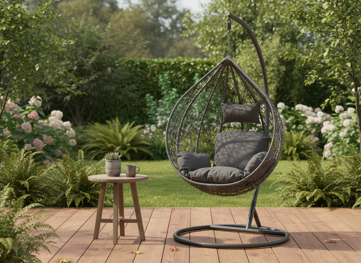 Szykowny i nowoczesny – ten fotel wiszący w głębokim odcieniu ciemnej szarości to prawdziwa perełka dla miłośników stonowanego designu. Kompaktowy, ale niezwykle wygodny – doskonały na balkon, taras lub do wnętrza.