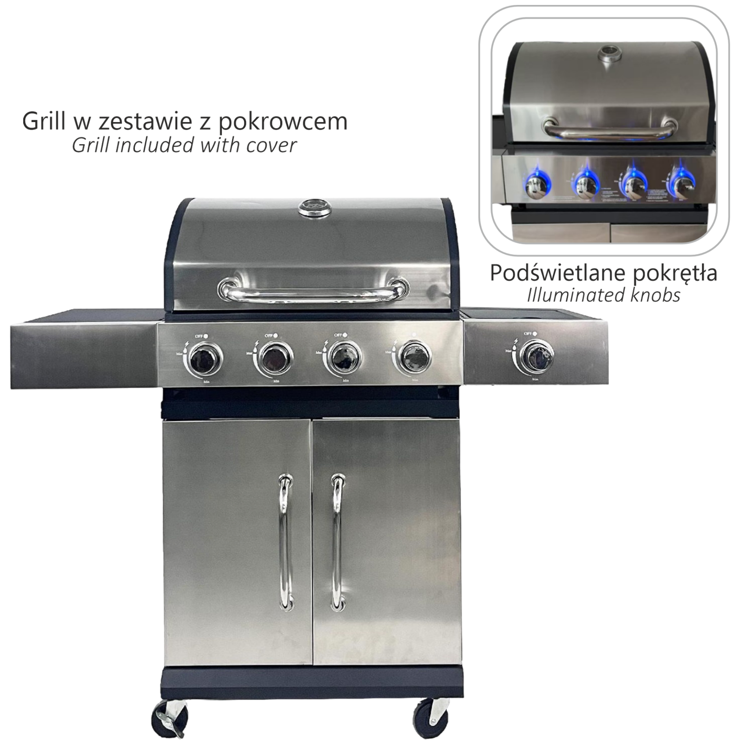 Z 4 palnikami głównymi + bocznym, mocą 13 kW i rusztami żeliwnymi, oferuje profesjonalne warunki do przygotowania idealnych dań. A do tego podświetlane pokrętła, pokrowiec w zestawie i stylowe wykończenie ze stali nierdzewnej ✨
