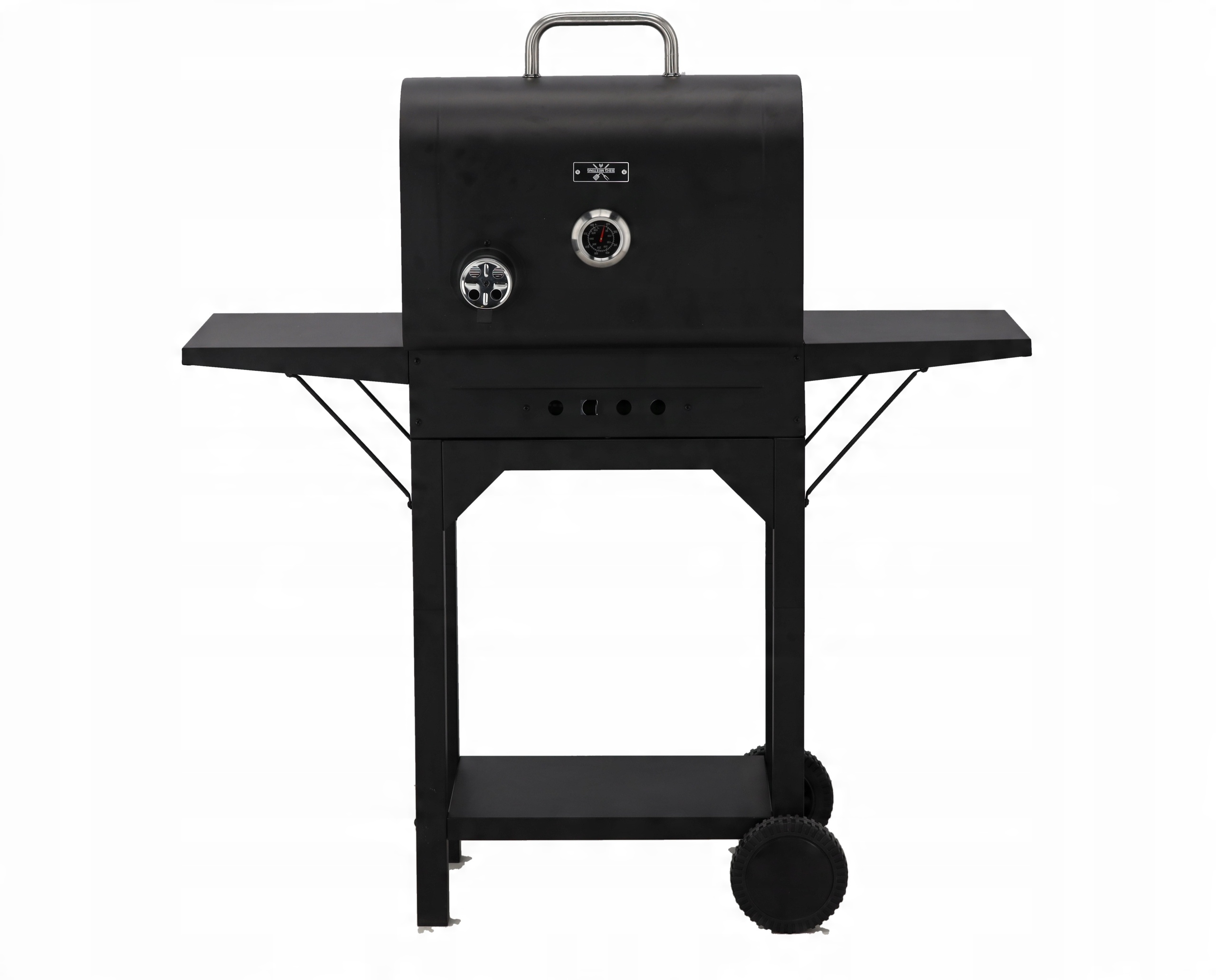 Grill węglowy z pokrywą, rusztem i kółkami, wykonany z wysokiej jakości stali węglowej, idealny do grillowania na świeżym powietrzu. Posiada funkcjonalne akcesoria, w tym termometr, popielnik oraz boczne półki.
