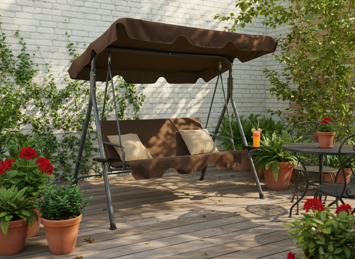Połączenie brązowej konstrukcji z beżowymi poduszkami sprawia, że huśtawka doskonale komponuje się z otoczeniem. Stal malowana proszkowo i wodoodporny poliester gwarantują trwałość przez wiele sezonów 🌞