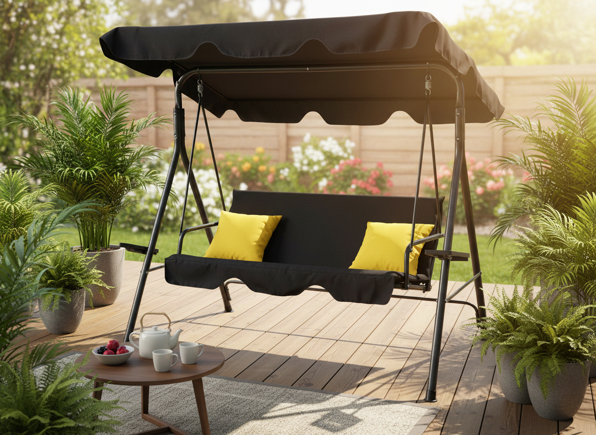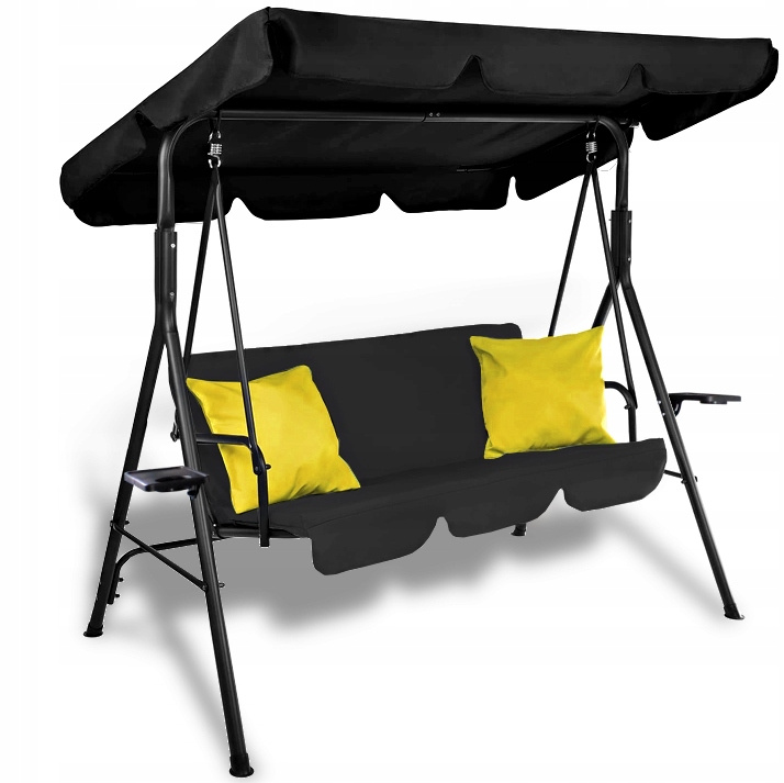 HUŚTAWKA OGRODOWA A-TYPE – CZARNA Z ŻÓŁTYMI PODUSZKAMI 🌞