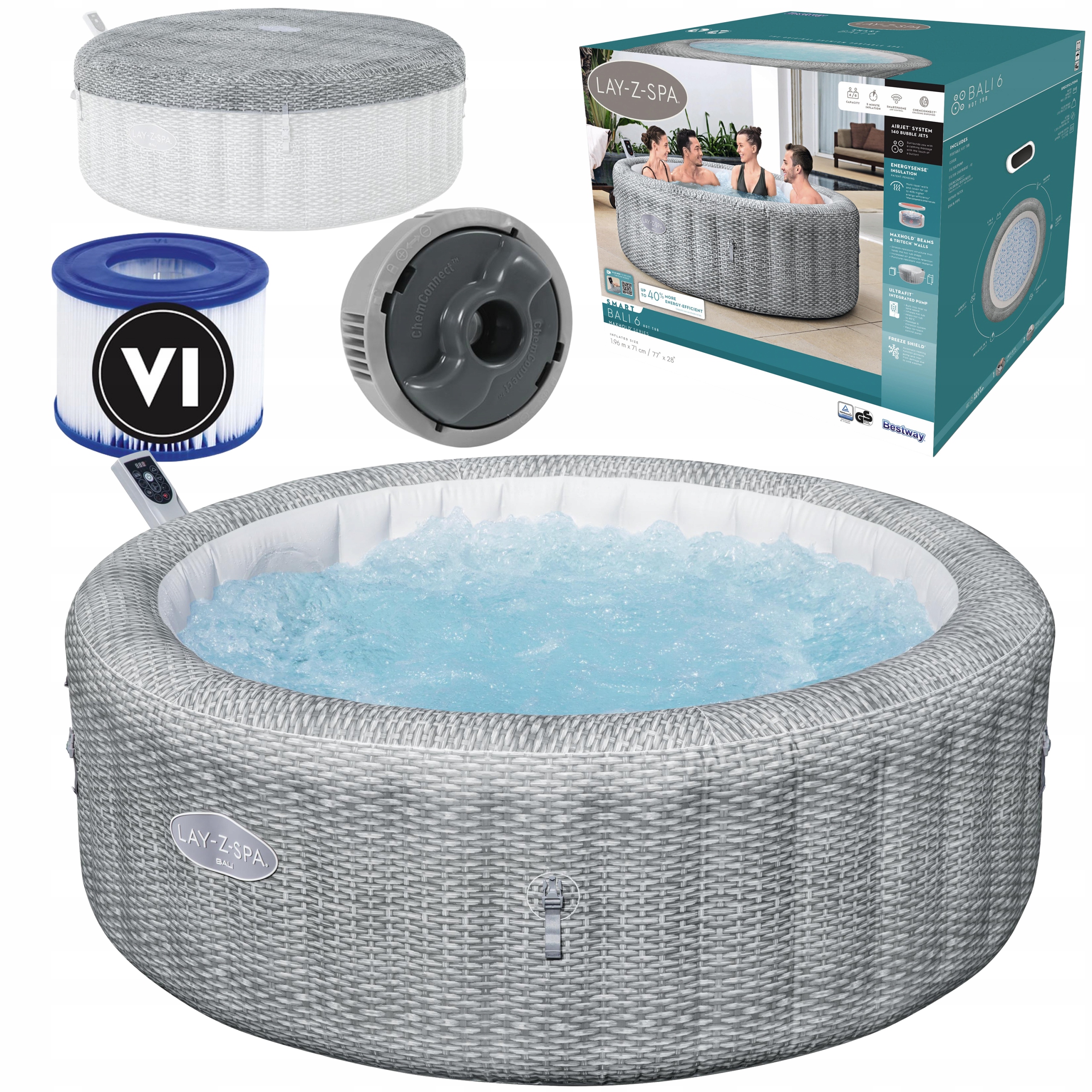 Jacuzzi Lay-Z-Spa Bali AirJet to wygodne jacuzzi dla 4-6 osób, zapewniające wyjątkowy relaks dzięki technologii AirJet™. Wymiary po napompowaniu to 196 cm x 71 cm, a wewnętrzny rozmiar wynosi 151 cm, co daje wystarczająco dużo przestrzeni do komfortowego odpoczynku. Woda podgrzewana jest do maksymalnej temperatury 40°C, a energooszczędny system podgrzewania utrzymuje optymalną temperaturę wody w ciągu godziny.