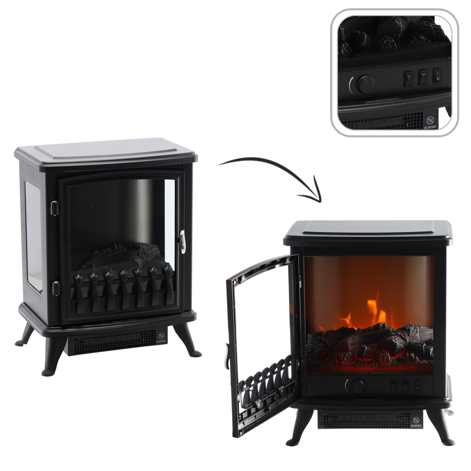 Wolnostojący kominek elektryczny z realistycznym efektem płomienia to doskonały sposób na stworzenie przytulnej atmosfery w każdym wnętrzu. Trzy przeszklone okienka – drzwiczki oraz dwie boczne ściany – zapewniają efekt głębi i naturalnego ognia, który wprowadza magiczny nastrój. ✨