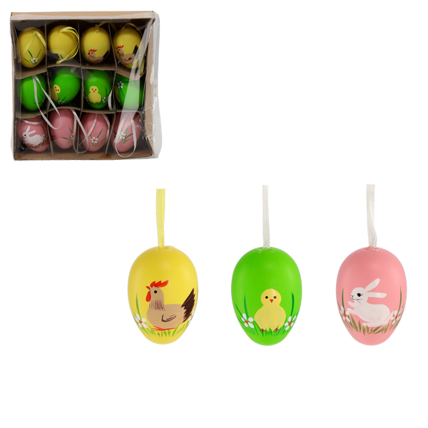 KPL. 12 JAJEK WIELKANOCNYCH 19 x 19 x 5 CM Z ZAWIESZKĄ ŻÓŁTY - ZIELONY - RÓŻOWY * 8203