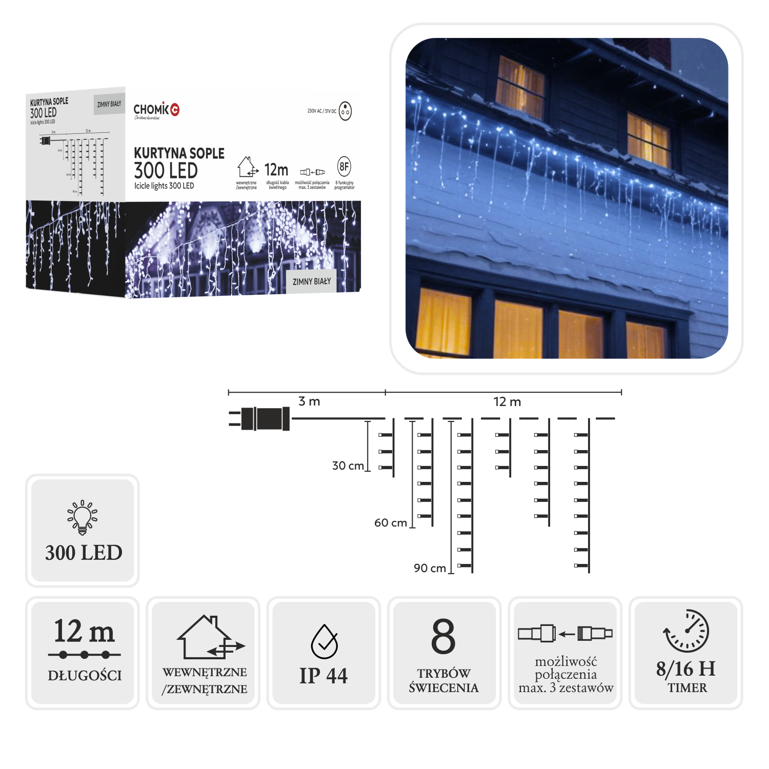 - Długość sopli: 30 / 60 / 90 cm | Ilość sopli: 50