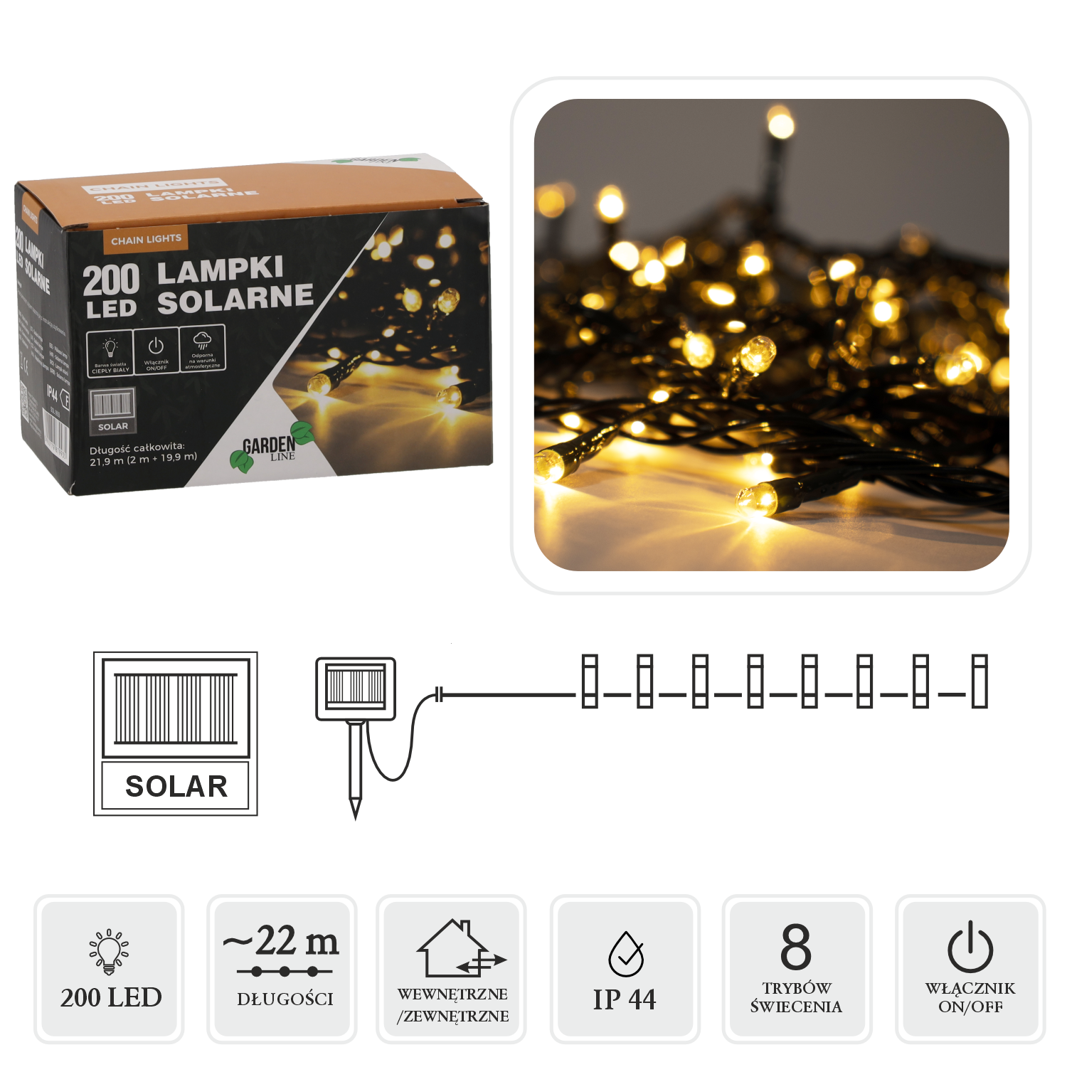 LAMPKI LED SOLARNE 200L CIEPŁY BIAŁY, DŁ. 2 + 20 M ✨
