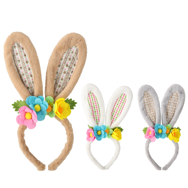 OPASKA NA GŁOWĘ - USZY KRÓLIKA Z KWIATKAMI 16 x 32 CM MIX 3 WZORÓW opak=12szt *9168