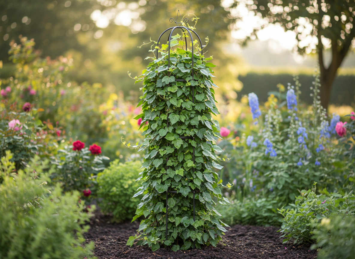 Zaprojektowana z metalowych rurek malowanych proszkowo, z dekoracyjnym wykończeniem u góry, tworzy wizualnie lekką, ale stabilną konstrukcję dla groszku pachnącego, klematisów i innych pnączy. 🌿