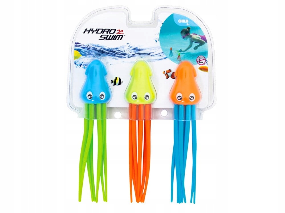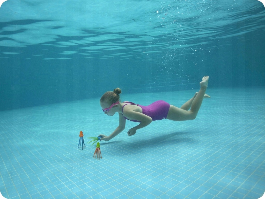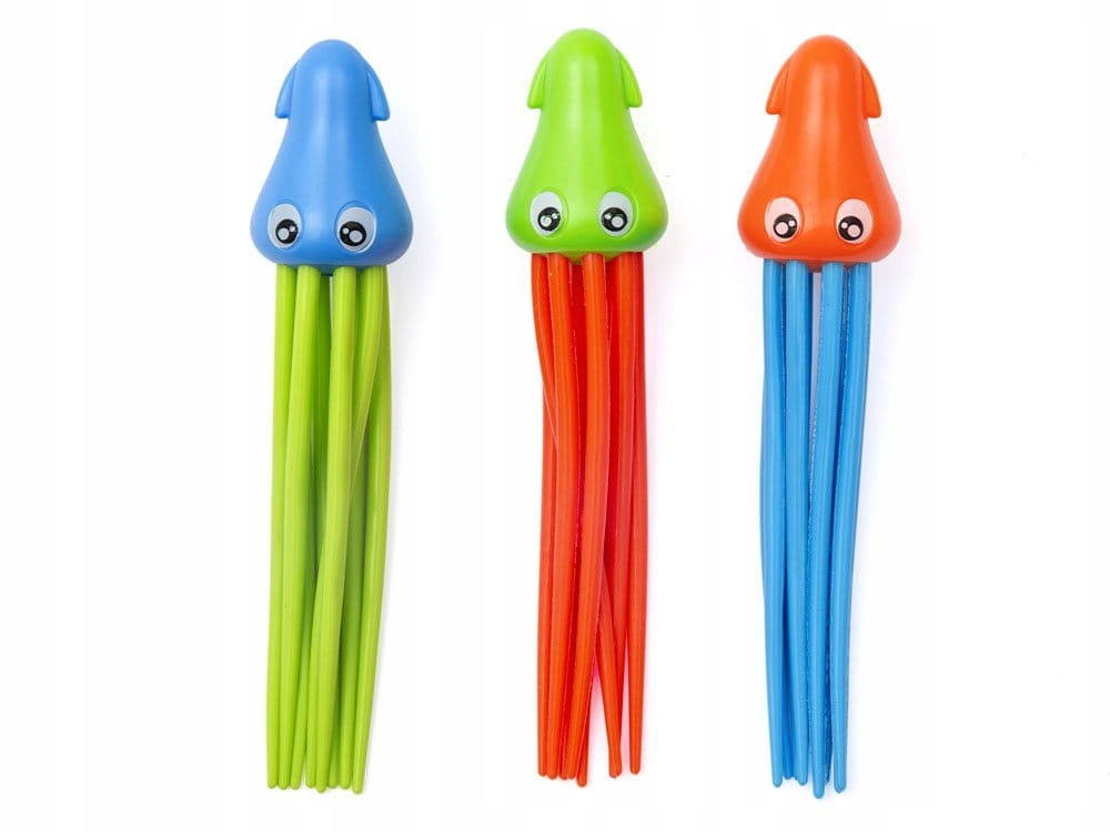 Ten wspaniały zestaw do podwodnych zabaw będzie ogromną frajdą dla Twojego dziecka, które razem z przyjaciółmi będzie mogło urządzać sobie podwodne zawody. Od teraz wakacyjne zabawy mogą być jeszcze ciekawsze i aktywniejsze. Zestaw przeznaczony jest dla dzieci od 3 roku życia i idealnie nadaje się do początkowej nauki pływania kształtując w dziecku ruch oraz oswajając z wodą. Ośmiorniczki do nurkowania są wykonane z bezpiecznych materiałów oraz nie zawierają lateksu. Posiadają obciążenie, które powoduje, że zawsze spadają na dno utrzymując się pionowo na swoich nóżkach.