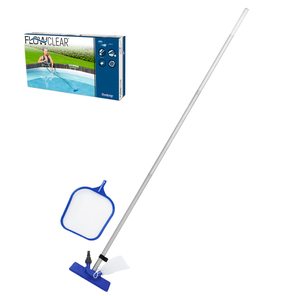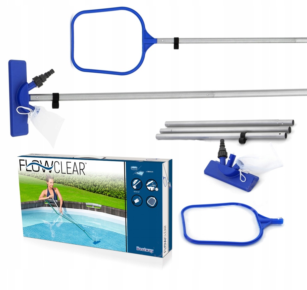 🛠️ Ten podstawowy zestaw czyszczący jest niezbędny jeśli pragniesz utrzymać zbiornik basenowy w czystości. Składa się z regulowanego, teleskopowego kija (rączki), do której można przyłączyć jedną z dwóch końcówek: siatkę do wyławiania nieczystości lub końcówkę odkurzacza, która poprzez podciśnienie (po podłączeniu do węża ogrodowego) wytwarza wir, który sprawia, że zanieczyszczenia zbierane z dna zbiornika trafiają do małej siateczki.