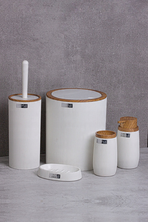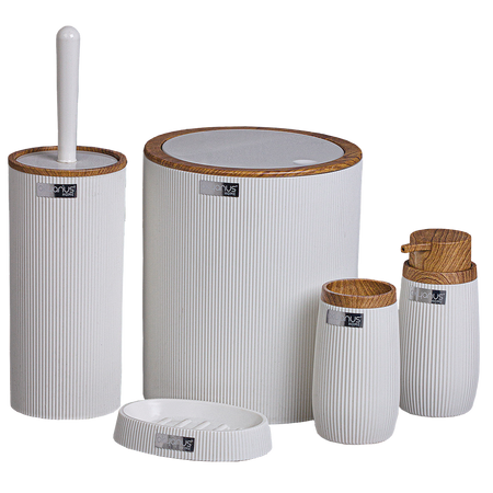 - Zestaw łazienkowy 5- elementowy okrągły w kolorze białym z wykończeniami imitującymi drewno wykonany z tworzywa sztucznego.