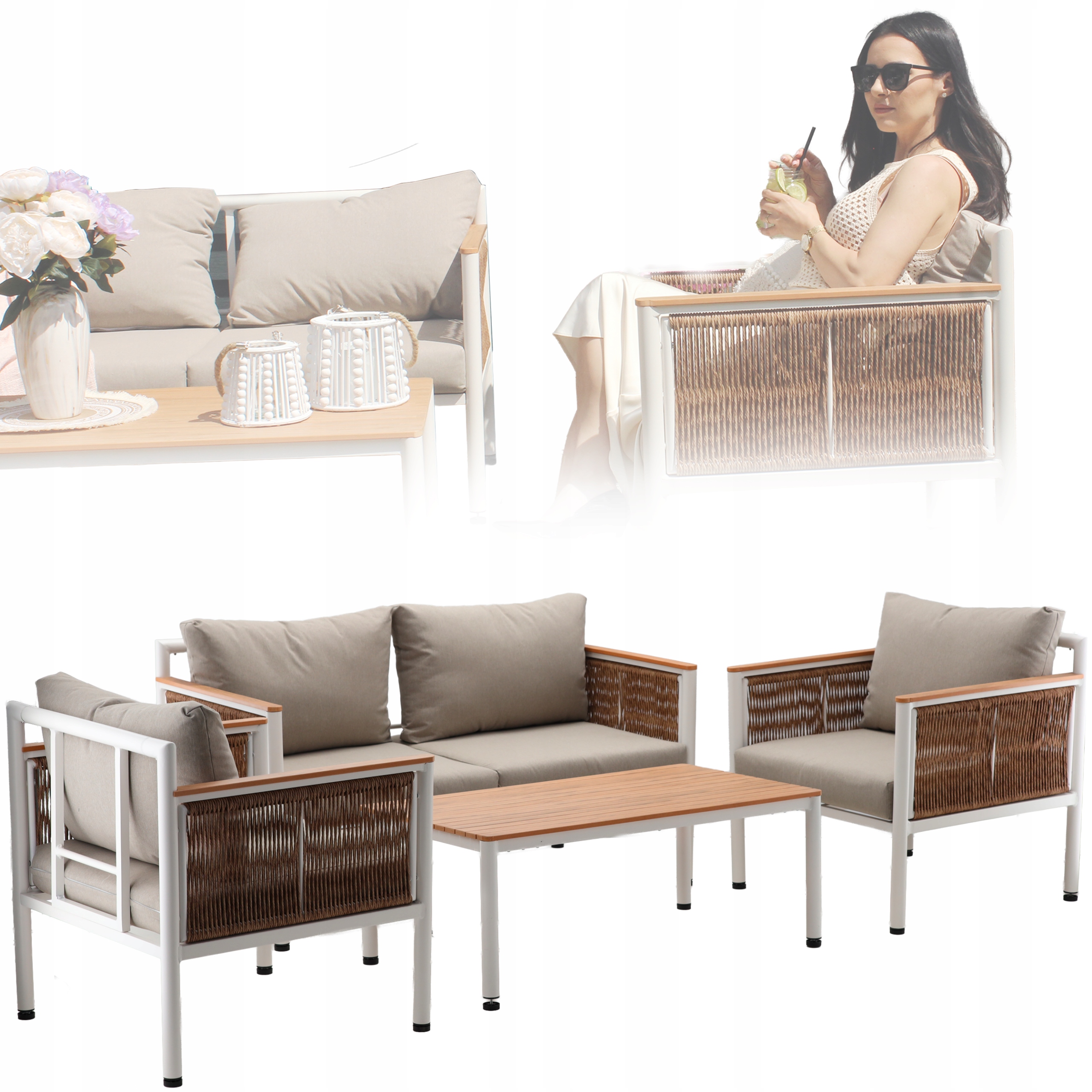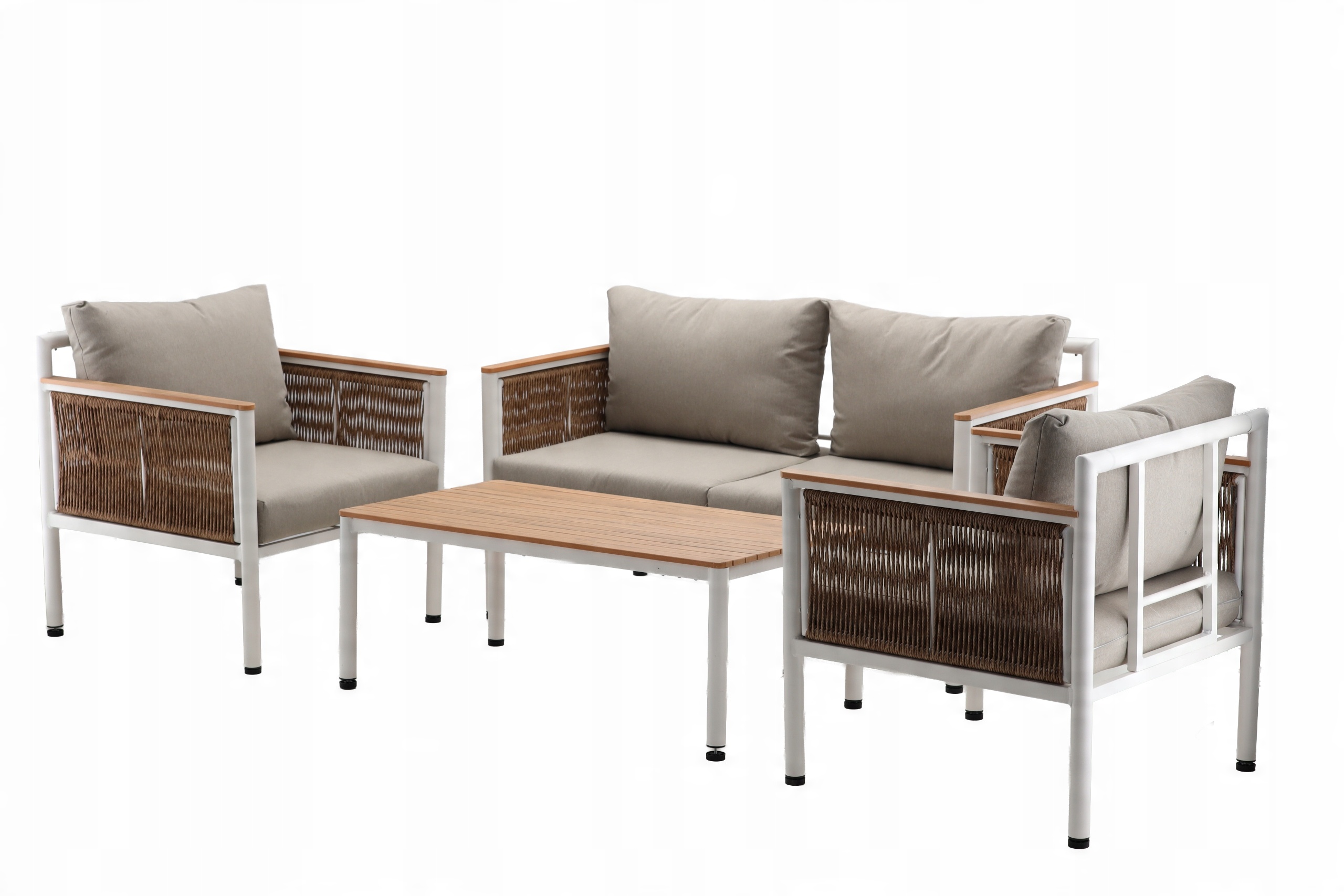 Stylowy i funkcjonalny zestaw wypoczynkowy składający się z dwuosobowej sofy, dwóch foteli oraz stolika kawowego to idealne rozwiązanie na taras, balkon, do ogrodu, oranżerii, a nawet nowoczesnego salonu. Połączenie białej aluminiowej konstrukcji, naturalnie wyglądającego polywoodu i neutralnych tkanin tworzy nowoczesną, lekką i przytulną przestrzeń do relaksu.
