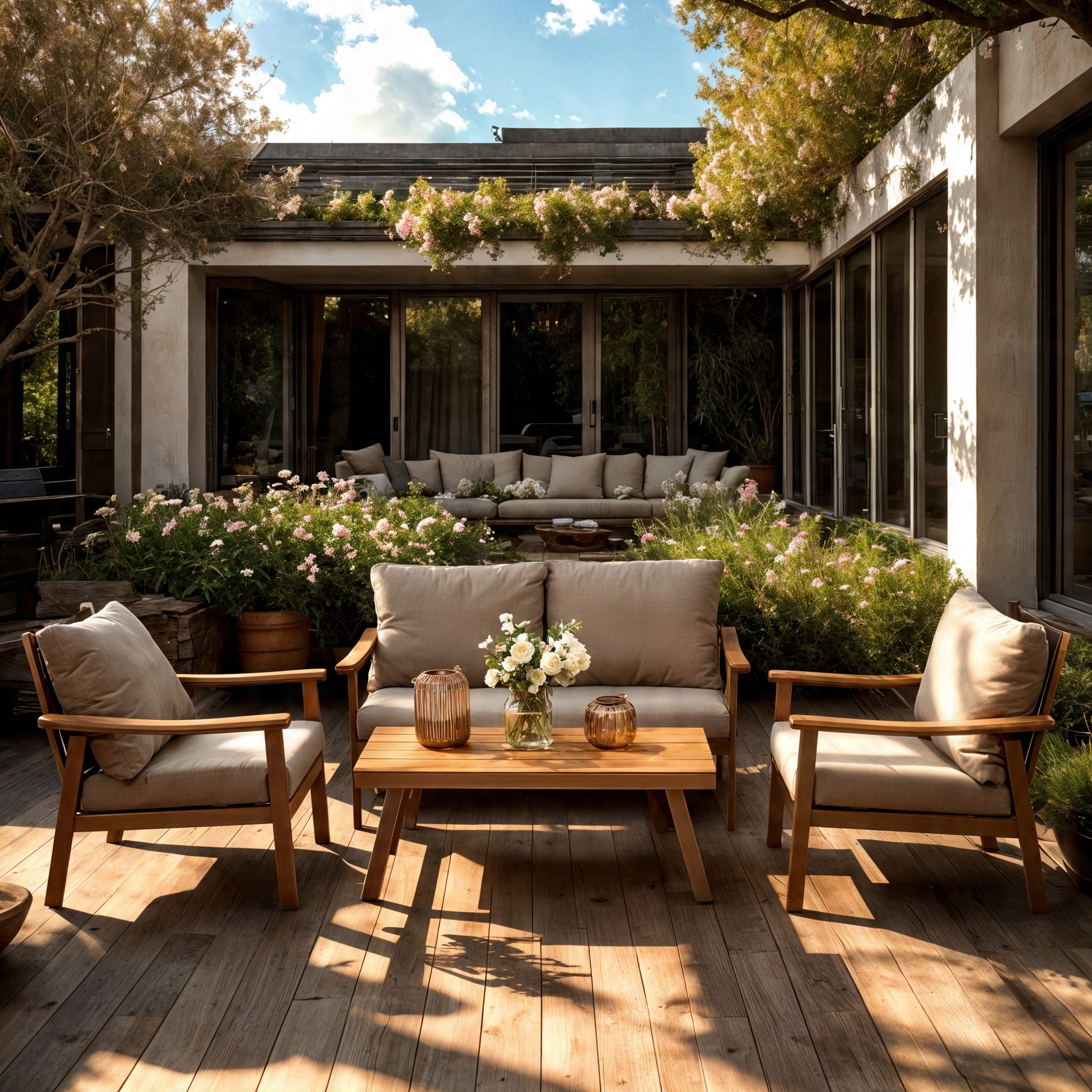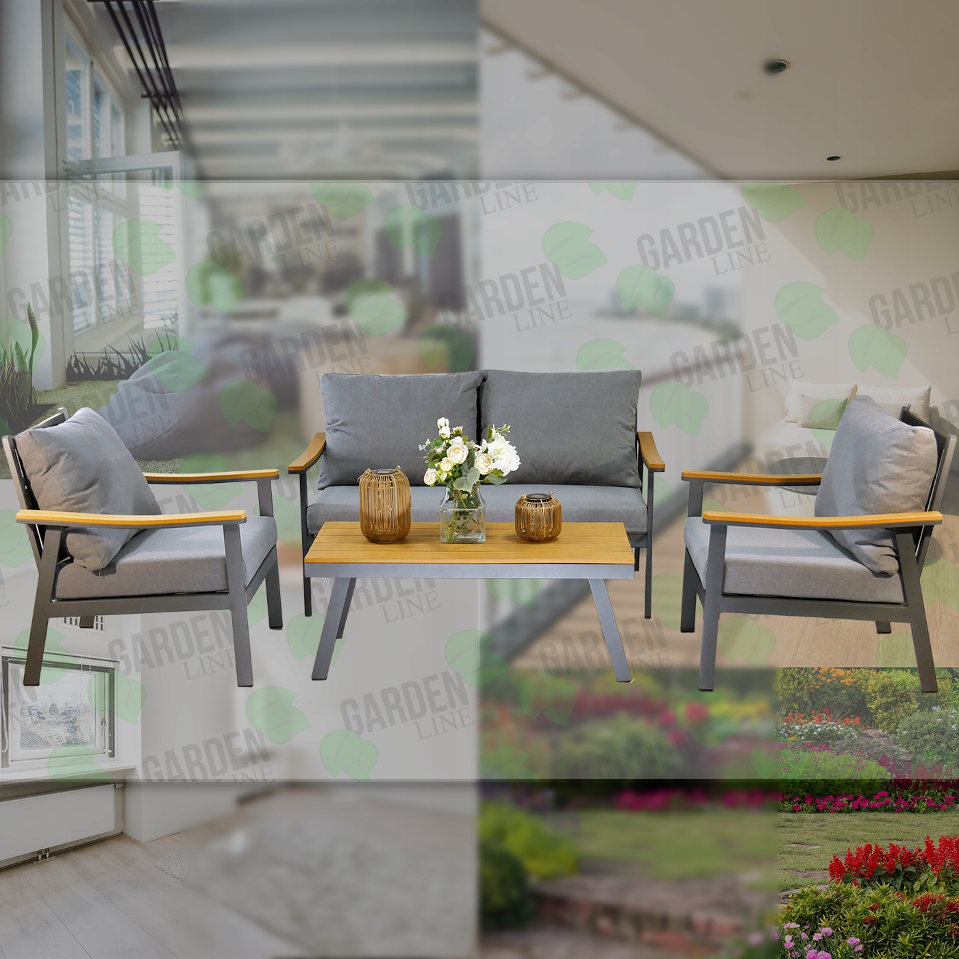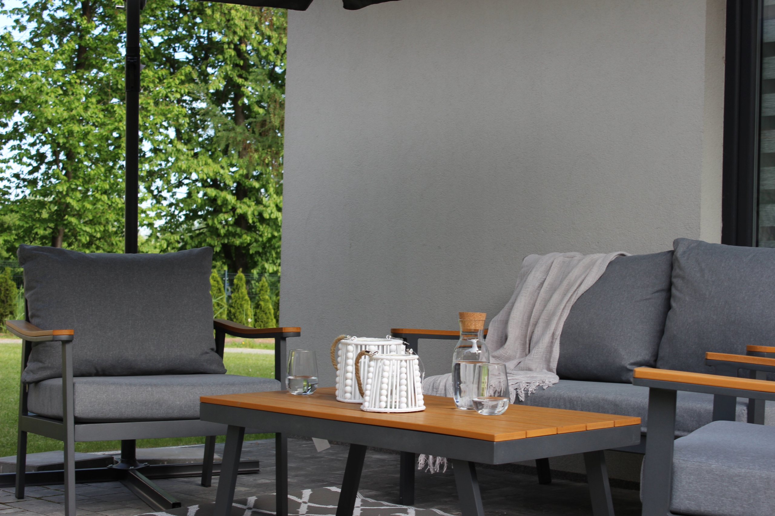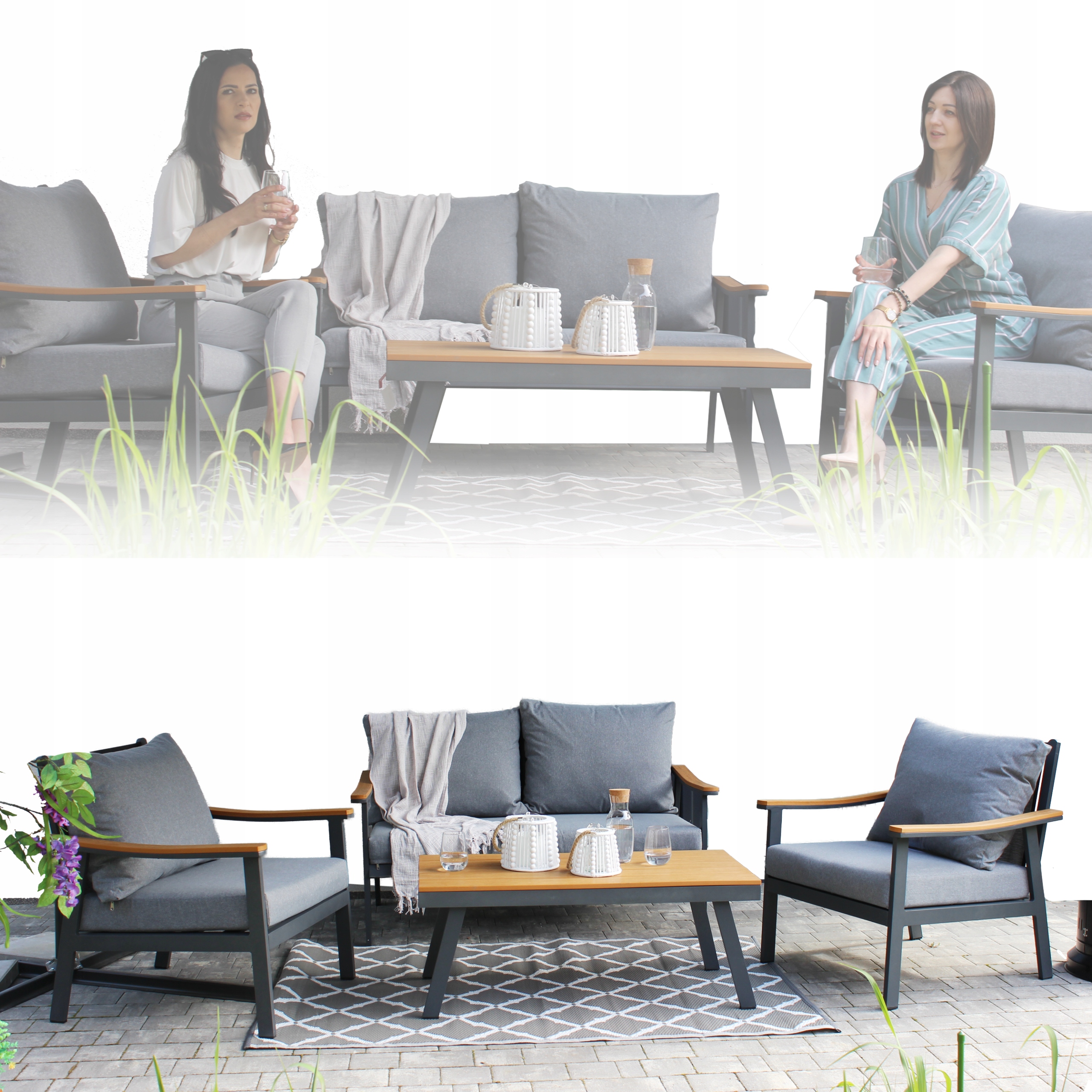 Elegancki i nowoczesny zestaw mebli aluminiowych, który doskonale sprawdzi się w ogrodzie, na tarasie lub w strefie relaksu. Połączenie aluminiowej ramy z elementami imitującymi drewno oraz siatką Textilene zapewnia trwałość, komfort użytkowania i odporność na warunki atmosferyczne.
