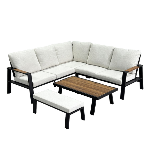 ZESTAW MEBLI ALUMINIOWYCH "PRISZTINA" (SOFA NAROŻNA + ŁAWKA + STOLIK) CZARNY + BEŻOWE PODUSZKI *8215