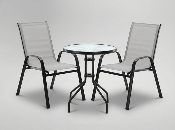 - Elegancki zestaw mebli balkonowych w kolorze szarym: stolik ze szkłem hartowanym oraz dwa wygodne krzesła z plecionki tekstylenowej. Idealny na balkon, taras i do ogrodu. Solidna konstrukcja, nowoczesny styl i oszczędność miejsca.