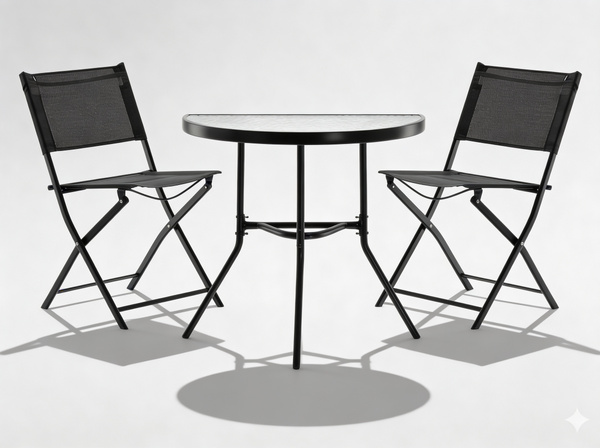 - Elegancki zestaw mebli balkonowych Garden Line: stolik półksiężyc ze szkłem hartowanym i 2 składane krzesła. Idealny na balkon i taras. Kompaktowy, trwały, oszczędza miejsce i zapewnia komfort użytkowania.